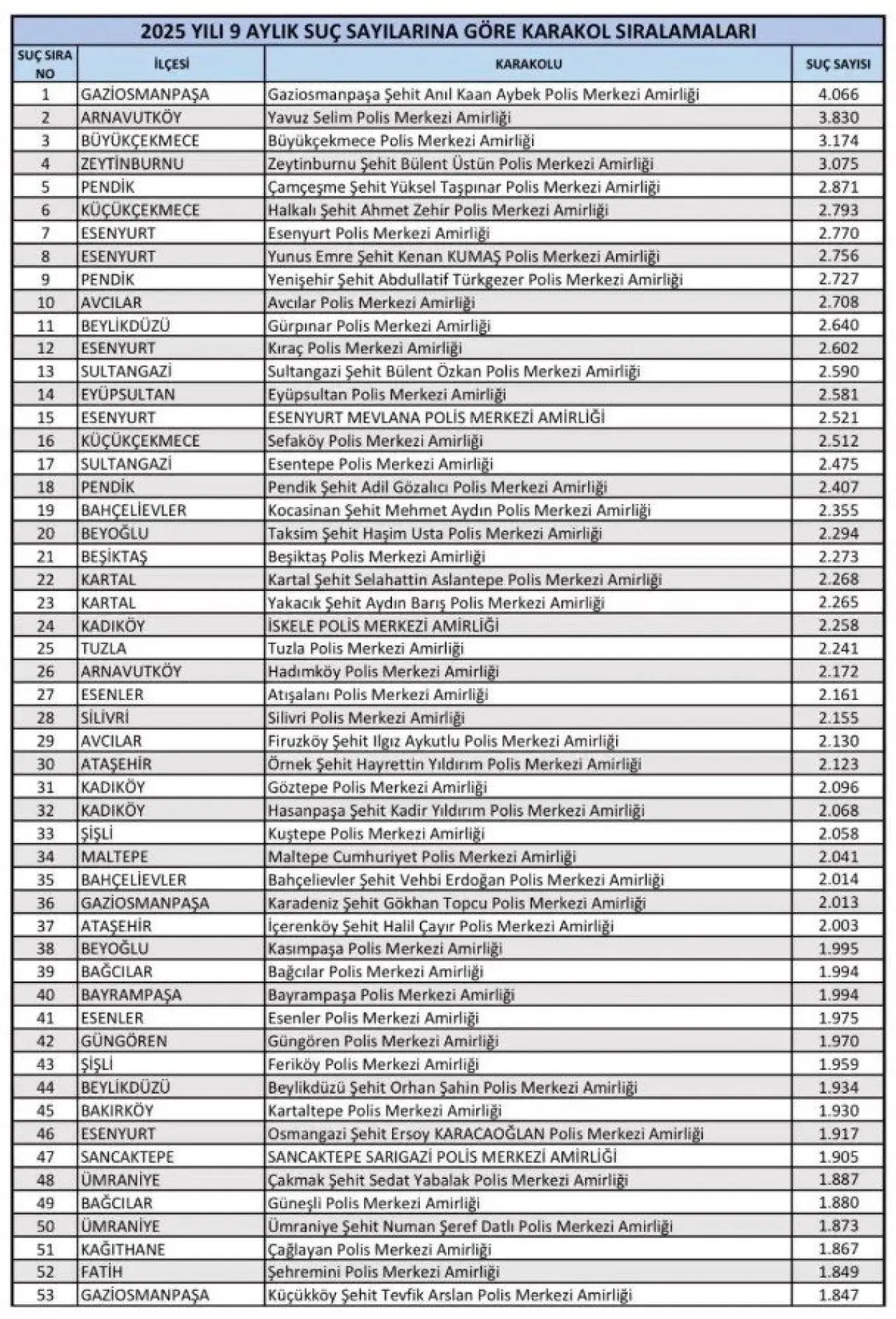 İstanbul Emniyet Müdürlüğü verilerine göre, 2025 yılının Ocak–Eylül döneminde kent genelinde yaşanan suç oranlarının haritasını çıkarıldı. Buna göre yılın ilk 9 ayında en fazla suç kaydı Gaziosmanpaşa Şehit Anıl Kaan Aybek Polis Merkezi Amirliğinde tutuldu. Karakolda toplam 4 bin 66 suç kaydı yer aldı.