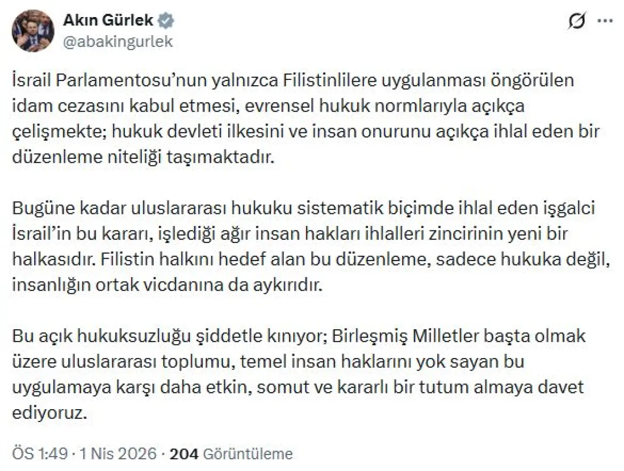 Adalet Bakanı Akın Gürlek, sanal medya hesabından yaptığı açıklamada, "İsrail parlamentosunun yalnızca Filistinlilere uygulanması öngörülen idam cezasını kabul etmesi, evrensel hukuk normlarıyla açıkça çelişmekte; hukuk devleti ilkesini ve insan onurunu açıkça ihlal eden bir düzenleme niteliği taşımaktadır. Bugüne kadar uluslararası hukuku sistematik biçimde ihlal eden işgalci İsrail’in bu kararı, işlediği ağır insan hakları ihlalleri zincirinin yeni bir halkasıdır. Filistin halkını hedef alan bu düzenleme, sadece hukuka değil, insanlığın ortak vicdanına da aykırıdır. Bu açık hukuksuzluğu şiddetle kınıyor; Birleşmiş Milletler başta olmak üzere uluslararası toplumu, temel insan haklarını yok sayan bu uygulamaya karşı daha etkin, somut ve kararlı bir tutum almaya davet ediyoruz" ifadelerini kullandı.
