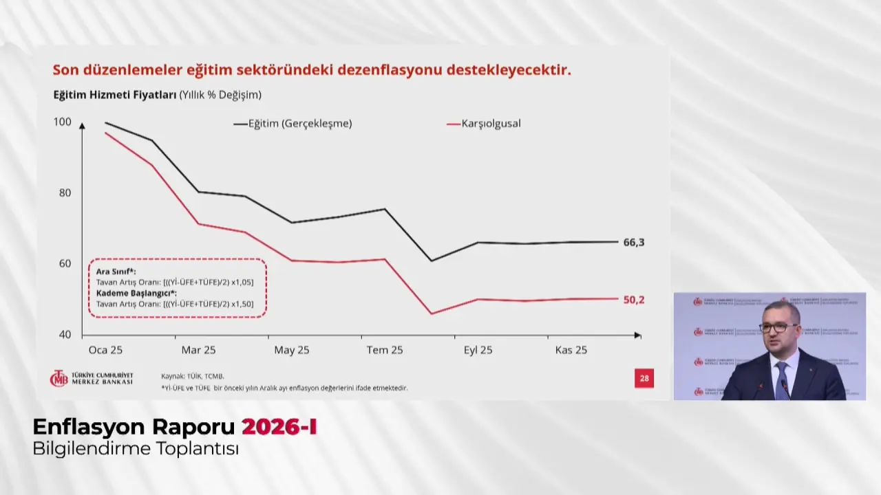 Karahan, “Eğitim tarafında ise; fiyat ayarlamalarına dair düzenlemelerde, geçmiş 24 ayın enflasyonu yerine 12 ayın etkisini yansıtacak şekilde değişikliğe gidilmesini önemli buluyoruz. Nitekim bu değişikliklerin, geçmiş enflasyona endeksleme mekanizmasını görece zayıflatarak dezenflasyon sürecini desteklemesini bekliyoruz. Örneğin, düzenleme 2025 yılında yürürlükte olsaydı şeklinde bir karşı olgusal analize baktığımızda, eğitim enflasyonunun 16 puan civarında aşağıda olabileceği sonucuna ulaşıyoruz. Bu bakımdan, düzenleme değişikliğinin 2026 yılı için ima ettiği rakamlar, eğitim tarafında dezenflasyon için belli bir alan olduğunu gösteriyor" dedi.