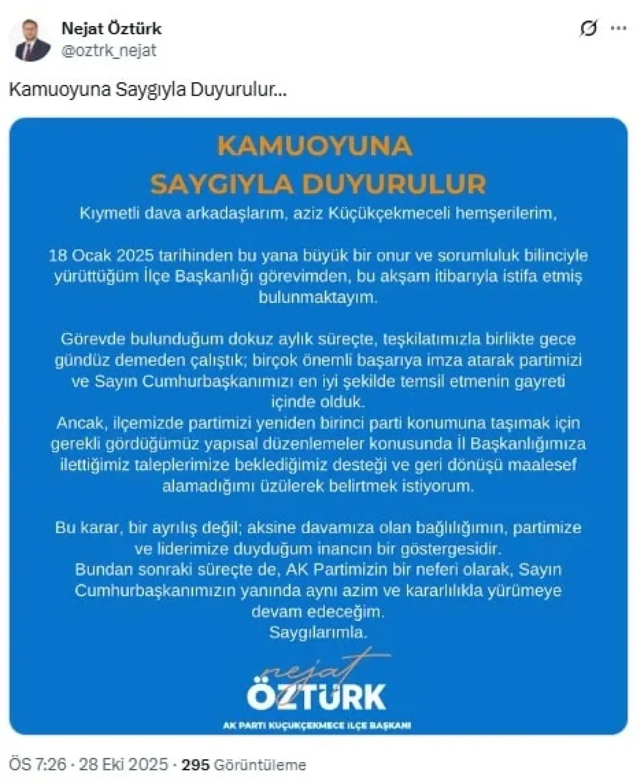 18 Ocak 2025 tarihinden bu yana büyük bir onur ve sorumluluk bilinciyle yürüttüğüm İlçe Başkanlığı görevimden, bu akşam itibarıyla istifa etmiş bulunmaktayım.