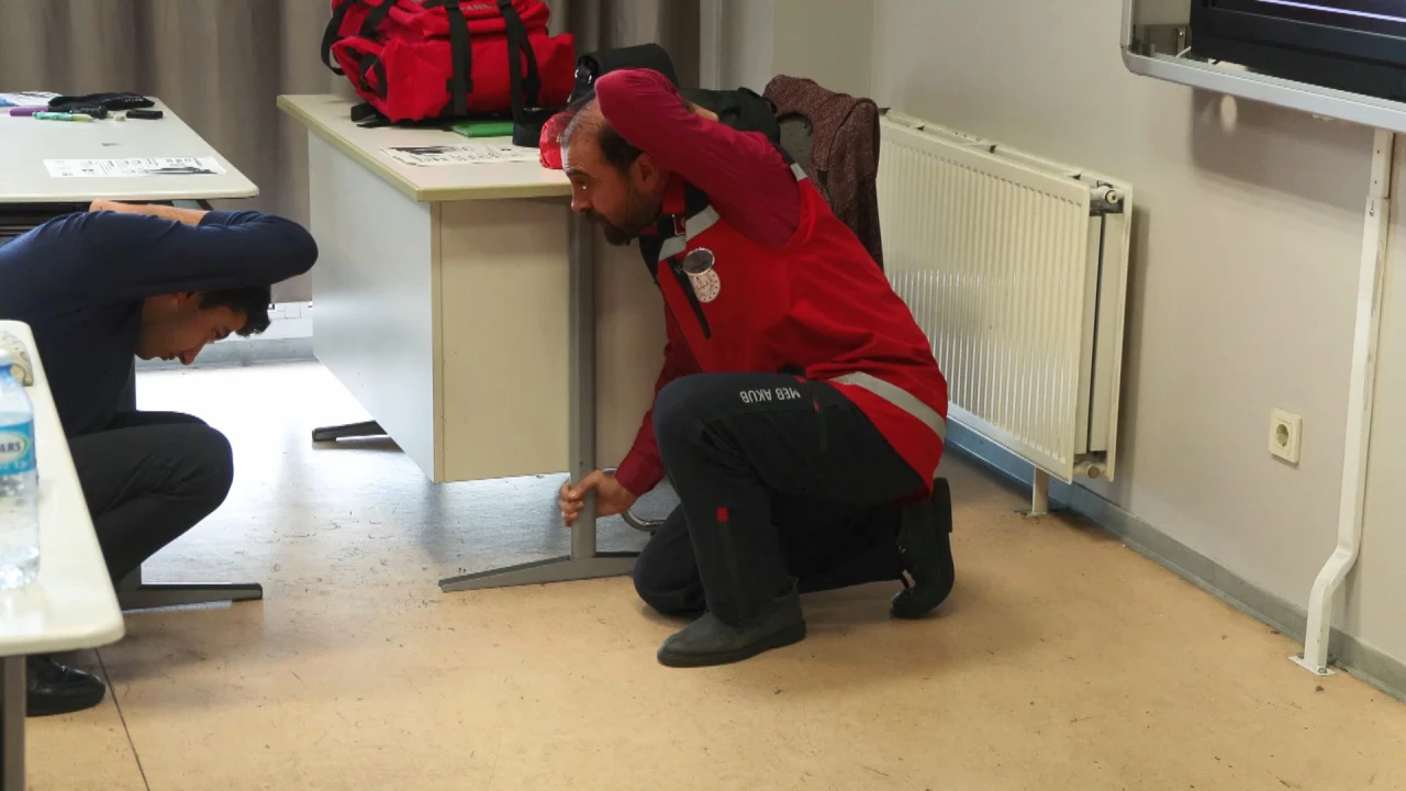 Deprem tatbikatında 'Çök, kapan, tutun' şeklinde deprem sırasında bulunulması gereken durum ve yapılması gerekenler anlatıldı. Öğrenciler ise eğitmenlerden 'Çök kapan tutun' pozisyonunu uygulamalı olarak öğrendi. Senaryo gereği deprem sırasında sirenler çalarken, sınıflardaki öğrenciler öğretmenleri eşliğinde merdivenlerden inerek okul bahçesinde toplandı. Deprem riski geçinceye kadar öğrenciler öğretmenleriyle bahçede beklemeye devam etti.