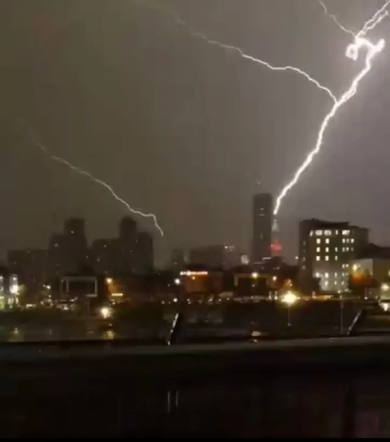 Sağanak yağış nedeniyle, Ümraniye'de Finans Merkezi'ndeki bir binaya yıldırım düştü. O anlar cep telefonuyla kaydedildi.