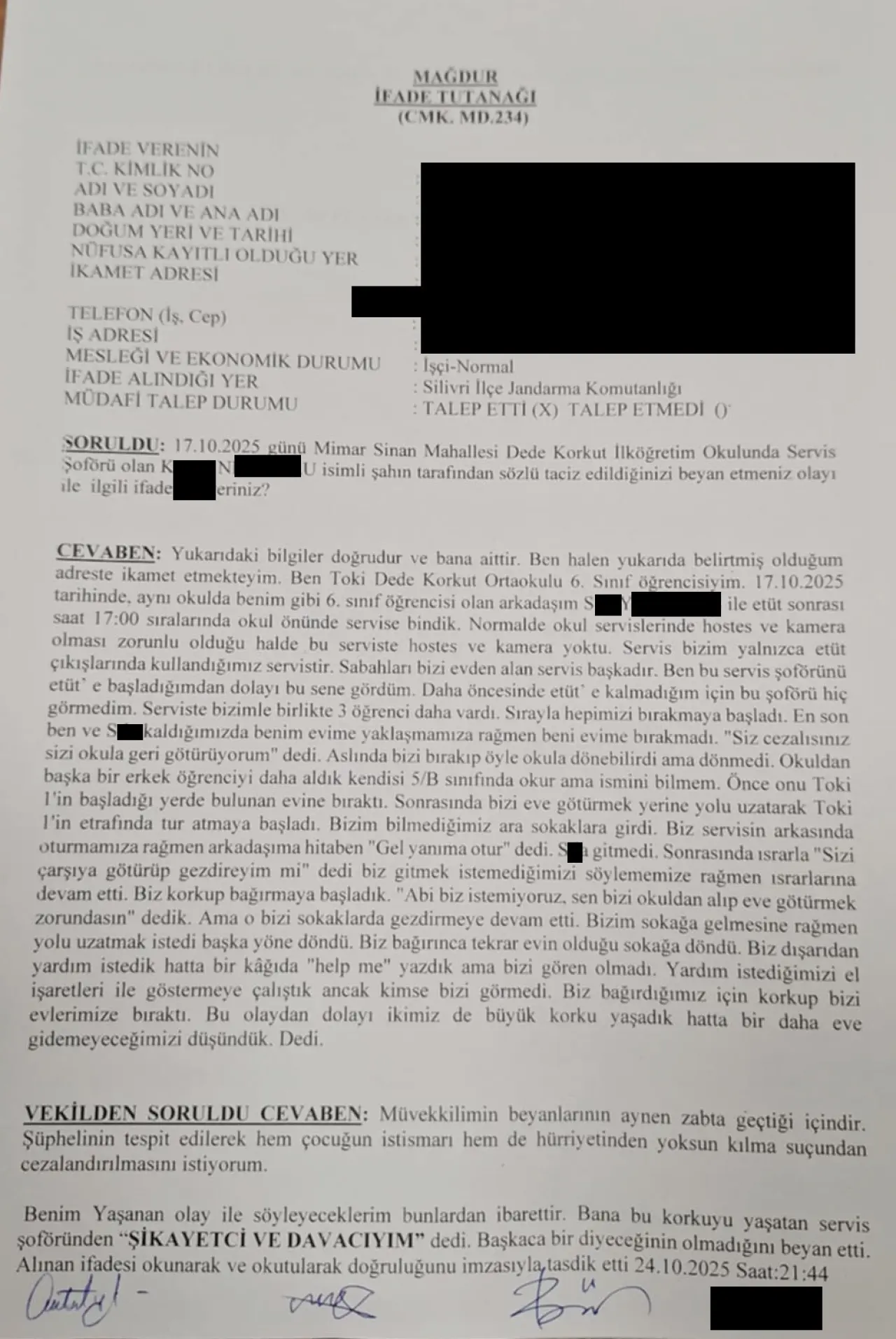 Silivri'nin Sesi adlı yerel haber sitesinin haberine göre Silivri TOKİ Dede Korkut İlkokulu ve Ortaokulu’nda okuyan öğrencileri evlerine bırakan servis şoförü araçta kalan son 2 kız öğrenciye önce “gelin yanıma oturun” teklifinde bulundu. 6. Sınıf öğrencisi ve henüz 11 yaşında olan kız çocukları teklifi reddedince servis şoförü bu defa “biraz gezelim” diyerek aracı öğrencilerin evinin güzergahından ara sokaklara sürmeye başladı. Bunun üzerine kız çocukları aracın camlarına vurarak ve bağırarak yardım istemeye çalıştı. Kızlardan biri çantasından çıkardığı defter kağıdına “yardım edin” yazarak aracın camından dışarı tuttu. Bunun üzerine panikleyen şoför çocukları evlerine bıraktı. Olaydan haberi olan aileler, konuyu Jandarma’ya iletti.