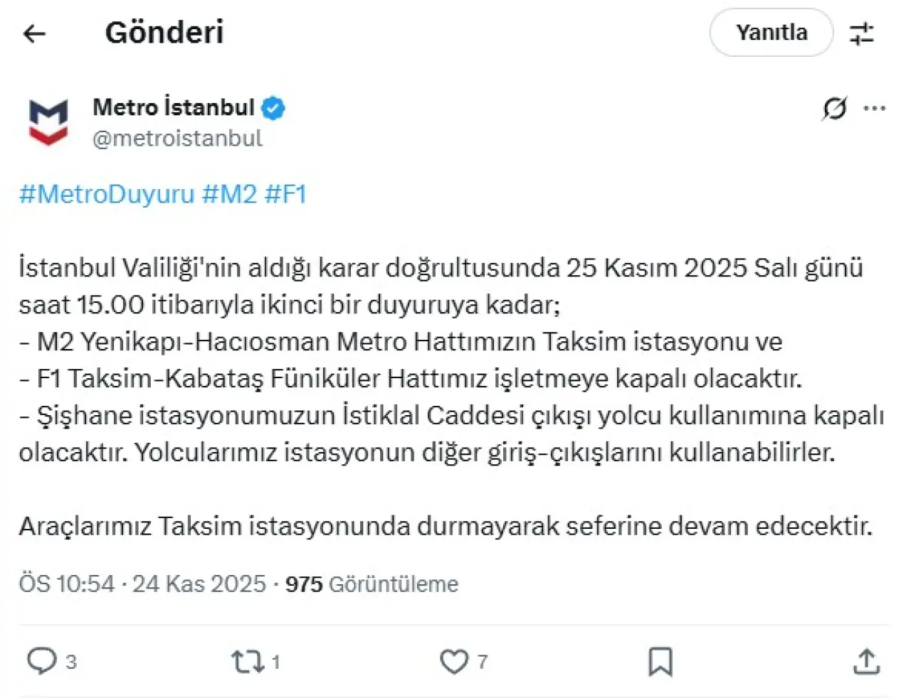 Metro İstanbul'un sosyal medya hesabından yapılan paylaşımda, "İstanbul Valiliği'nin aldığı karar doğrultusunda 25 Kasım 2025 Salı günü saat 15.00 itibarıyla ikinci bir duyuruya kadar; M2 Yenikapı-Hacıosman Metro Hattımızın Taksim istasyonu ve F1 Taksim-Kabataş Füniküler Hattımız işletmeye kapalı olacaktır. Şişhane istasyonumuzun İstiklal Caddesi çıkışı yolcu kullanımına kapalı olacaktır. Yolcularımız istasyonun diğer giriş-çıkışlarını kullanabilirler. Araçlarımız Taksim istasyonunda durmayarak seferine devam edecektir" açıklaması yer aldı. (DHA)