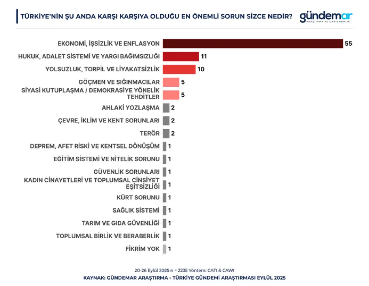 GÜNDEMAR’ın eylül ayı araştırmasının sonucuna göre katılımcıların yüzde 55’i Türkiye’nin en büyük sorunu olarak ekonomi, işsizlik ve enflasyonu gösteriyor. Ekonomiyi hukuk, adalet ve yargı bağımsızlığı (yüzde 11) ve yolsuzluk, torpil ve liyakatsizlik (yüzde 10) izliyor. Toplumun önceliği net: “Geçim derdi, adalet ve liyakat.” Araştırmaya göre göç, kutuplaşma, çevre, eğitim, kadın cinayetleri gibi diğer tüm sorunlar ekonomik kriz karşısında geri planda kalıyor.
