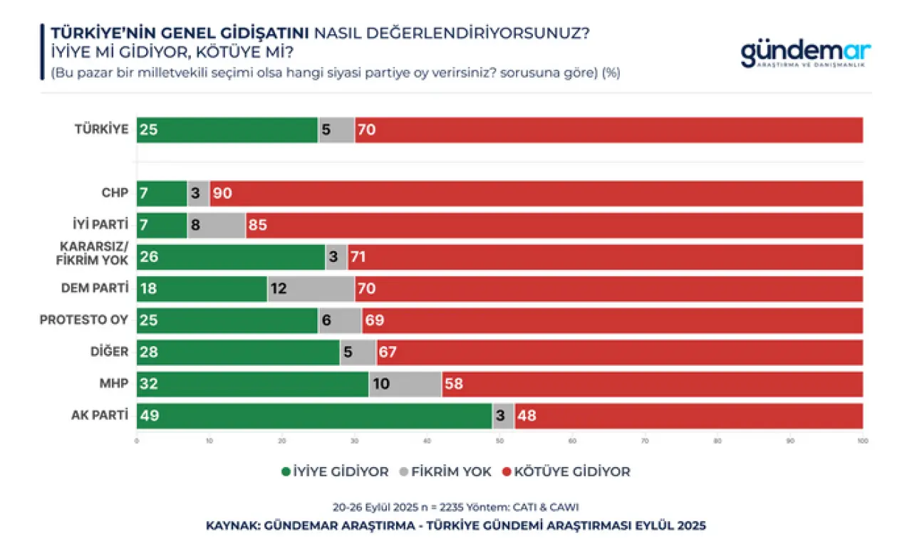 Katılımcıların yüzde 70’i Türkiye’nin genel gidişatını “kötüye gidiyor” olarak değerlendiriyor. Yalnızca yüzde 25 “iyiye gidiyor” diyor. AK Parti seçmeninin yüzde 49’u “iyiye gidiş”ten yana görüş bildiriyor. Ancak muhalefet seçmeninde CHP’de yüzde 90, İYİ Parti’de yüzde 85 oranında “kötüye gidiyor” algısı hâkim. Toplumun genelinde moral düşük; yalnızca iktidar tabanında göreli bir iyimserlik mevcut.