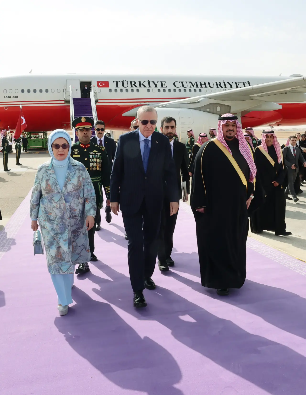 Cumhurbaşkanı Erdoğan’a, Suudi Arabistan ziyaretinde eşi Emine Erdoğan, Dışişleri Bakanı Hakan Fidan, Hazine ve Maliye Bakanı Mehmet Şimşek, Aile ve Sosyal Hizmetler Bakanı Mahinur Özdemir Göktaş, Enerji ve Tabii Kaynaklar Bakanı Alparslan Bayraktar, Sanayi ve Teknoloji Bakanı Mehmet Fatih Kacır, Gençlik ve Spor Bakanı Osman Aşkın Bak, Milli Savunma Bakanı Yaşar Güler, Sağlık Bakanı Kemal Memişoğlu, Cumhurbaşkanlığı İletişim Başkanı Burhanettin Duran, Cumhurbaşkanı Dış Politika ve Güvenlik Başdanışmanı Akif Çağatay Kılıç ile bazı yetkililer de eşlik ediyor.