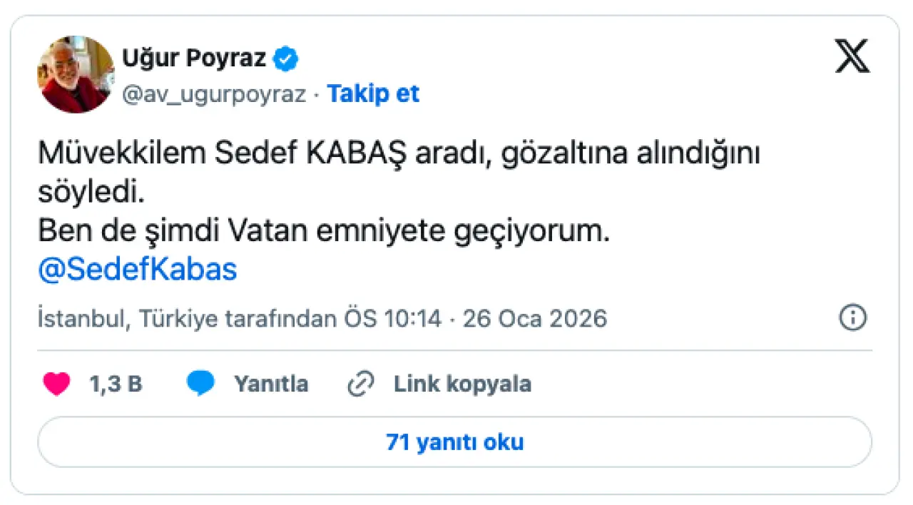 X platformunda yaptığı paylaşımı nedeniyle Anadolu Cumhuriyet Başsavcılığı, Kabaş hakkında “Cumhurbaşkanına hakaret” ve “suç işlemeye tahrik” suçlamalarıyla gözaltı kararı verdiğini açıkladı. Sedef Kabaş, yarın savcılığın talimatıyla Anadolu Adalet Sarayı’na sevk edilecek.