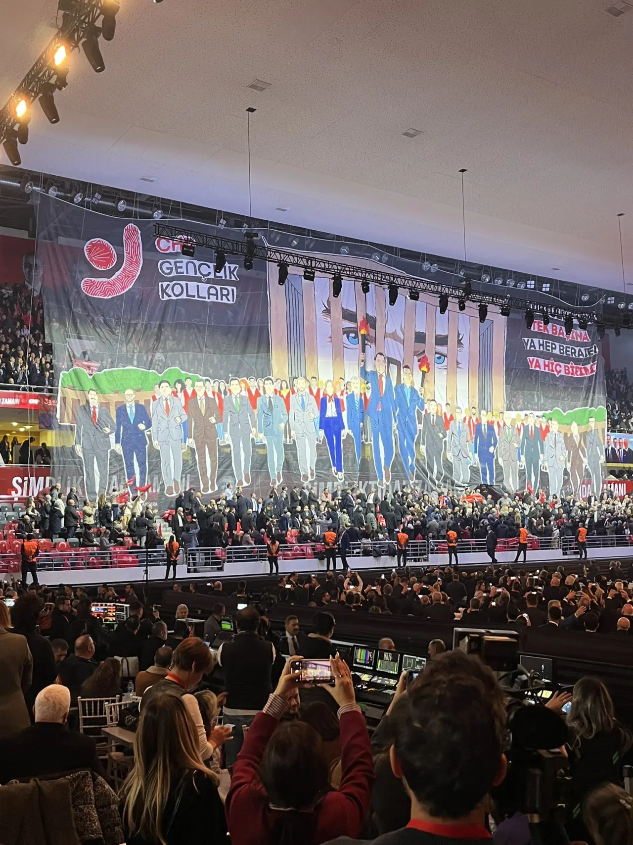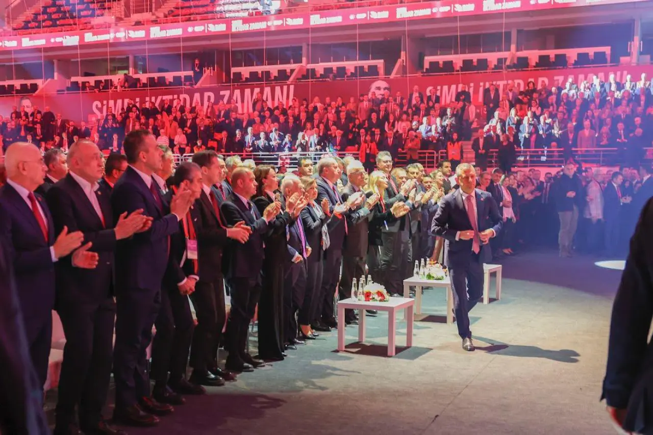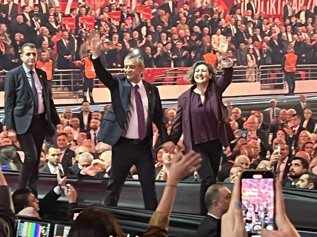 CHP lideri Özgür Özel, saat 10.15'te Ankara Spor Salonu'na geldi. Özel, kurultay salonunda eşi Didem Özel, ve CHP eski genel başkanlarından Murat Karayalçın ile yan yana oturuyor. CHP liderinin yanında Ekrem İmamoğlu'nun eşi Dilek İmamoğlu ve Muharrem İnce gibi isimler de yer alıyor.