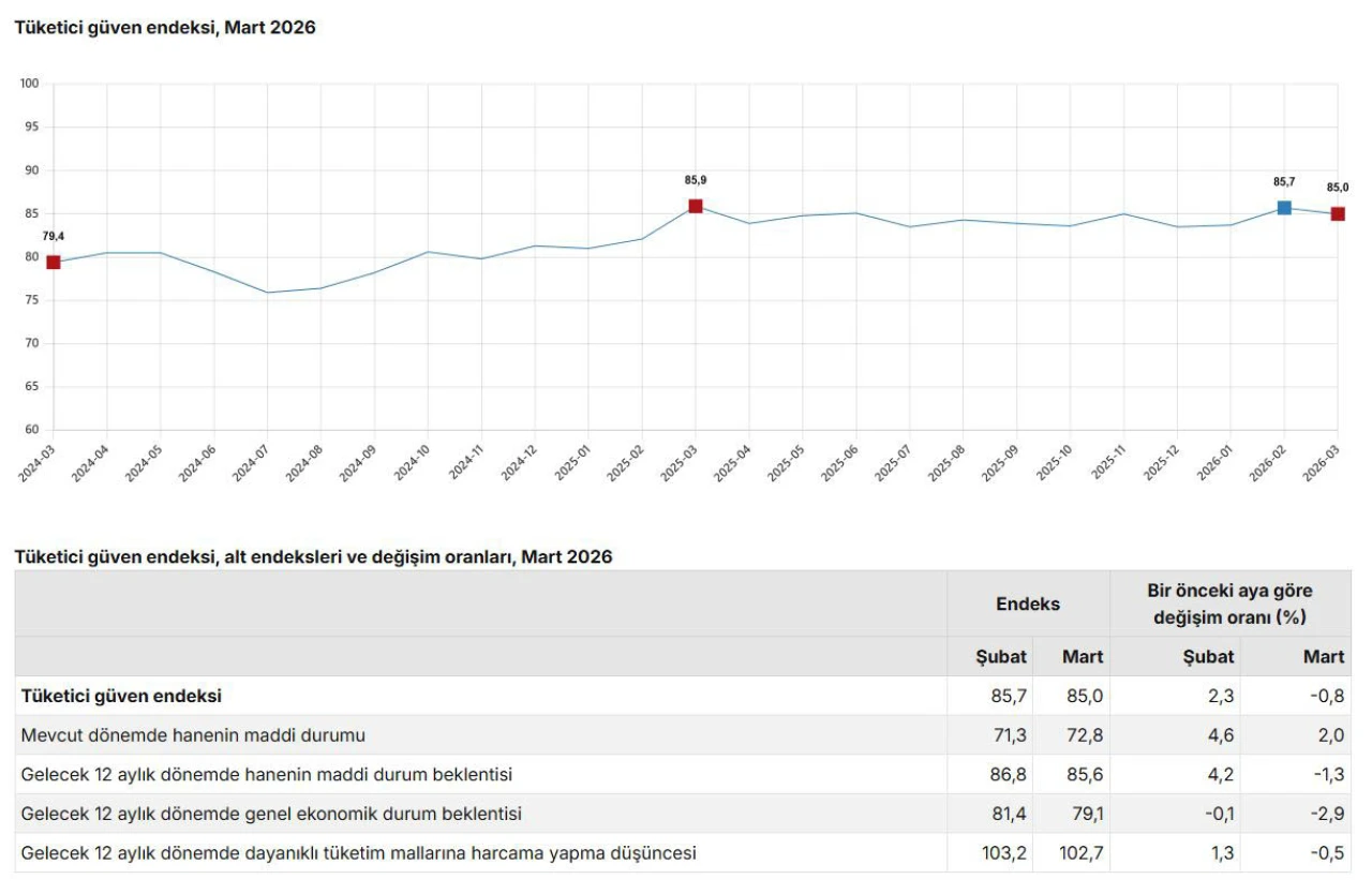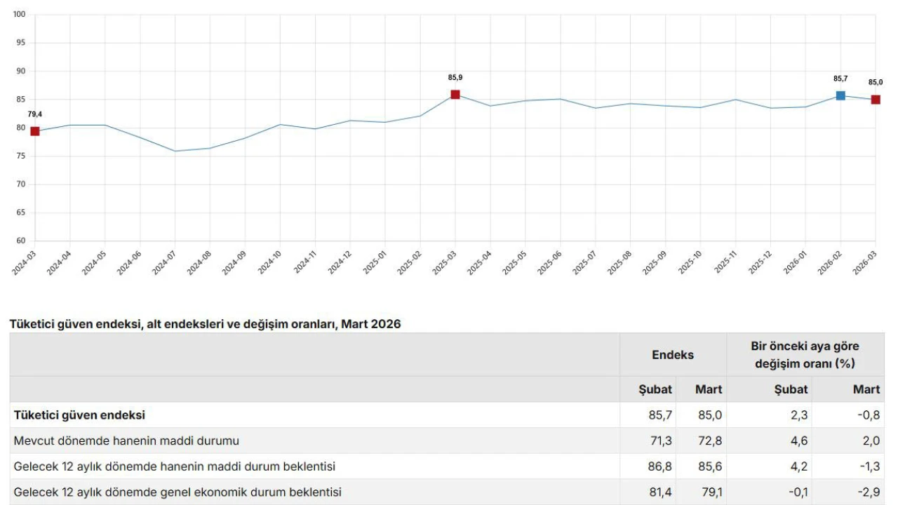 TÜİK, Mart 2026 dönemine ilişkin tüketici güven endeksi verilerini açıkladı. Buna göre; tüketici güven endeksi, mart ayında bir önceki aya göre yüzde 0,8 oranında azalarak 85 oldu. Alt endekslerine bakıldığında; mevcut dönemde hanenin maddi durumu endeksi yüzde 2 artarak 72,8, gelecek 12 aylık dönemde hanenin maddi durum beklentisi endeksi yüzde 1,3 azalarak 85,6, gelecek 12 aylık dönemde genel ekonomik durum beklentisi endeksi yüzde 2,9 azalarak 79,1, gelecek 12 aylık dönemde dayanıklı tüketim mallarına harcama yapma düşüncesi endeksi yüzde 0,5 azalarak 102,7 seviyesinde gerçekleşti.