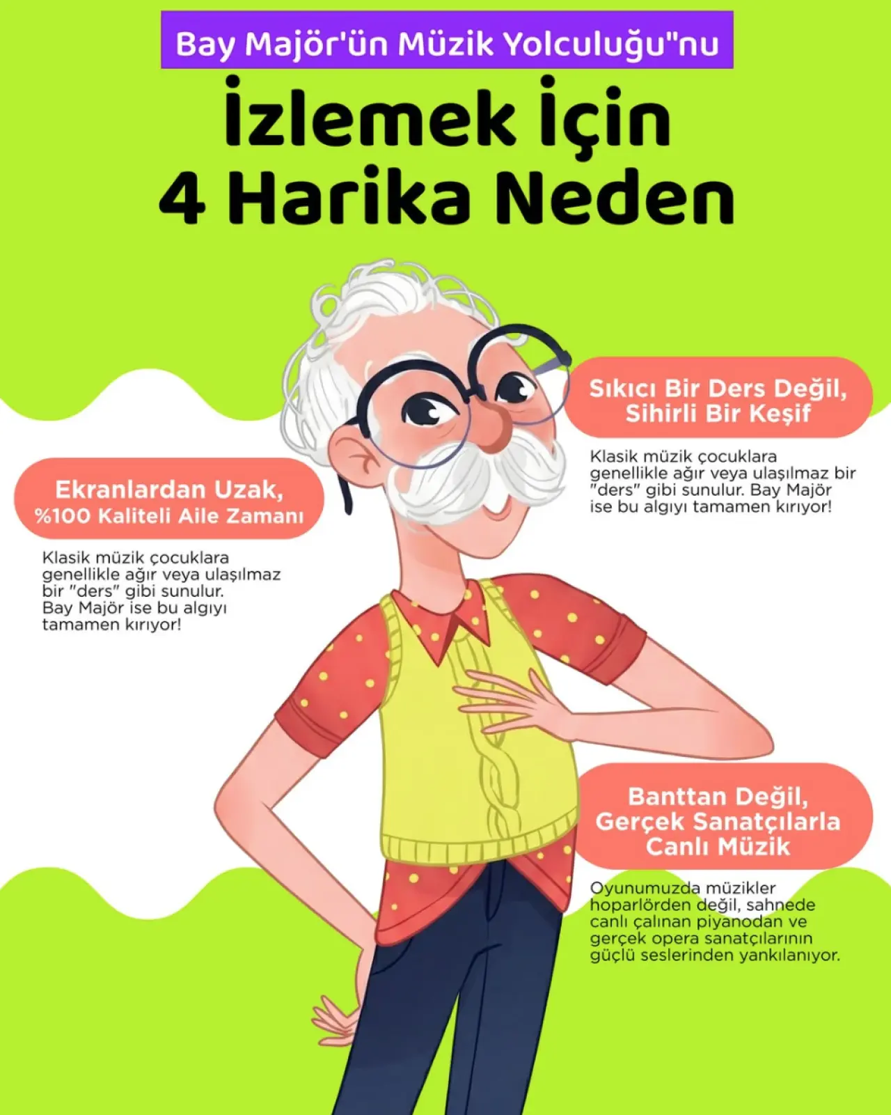 “Bay Majör’ün Müzik Yolculuğu”, klasik müziği çocuklar için eğlenceli ve öğretici bir sahne deneyimine dönüştürerek miniklerle buluşacak. Neşe Oğuzsoy’un yazıp anlattığı yapımda, sevilen karakter Bay Majör sahnede seyirciyi Mozart’ın dünyasında keyifli bir yolculuğa çıkaracak. Piyano, keman ve viyolonsel eşliğinde seslendirilecek canlı müzik performanslarına, soprano yorumuyla operalardan örnekler eşlik edecek. İnteraktif yapısıyla oyun, çocukları sözler, hareketler ve beden perküsyonu aracılığıyla sahnenin aktif bir parçası hâline getirecek. Yönetmenliğini Burcu Duru’nun, sanat yönetmenliğini ise Metin Bakı’nın üstlendiği oyun, eğlence ile müzik bilgisini bir araya getirerek klasik müziği sevdirmeyi hedefliyor. Bay Majör'ün Müzik Yolculuğu; 04 Nisan saat 13.00’de AKM Tiyatro Salonu’nda.