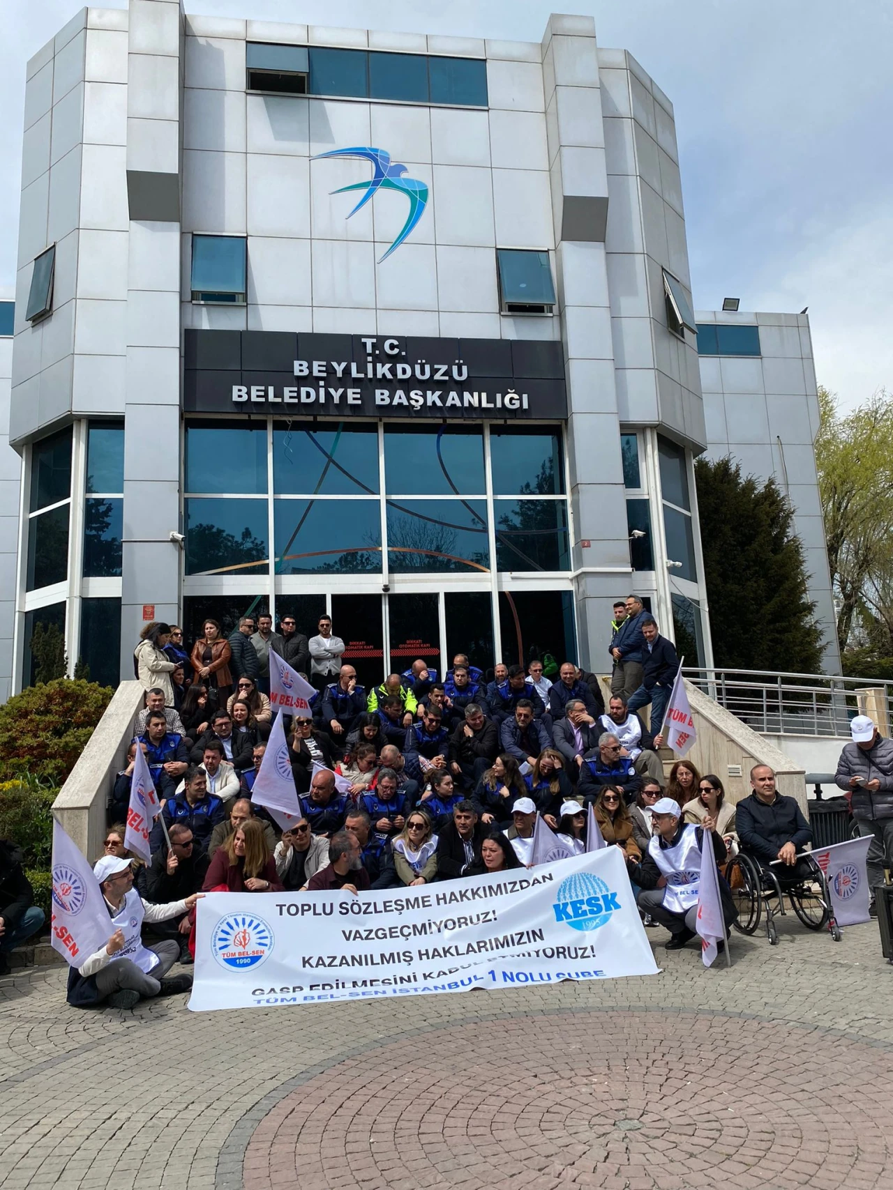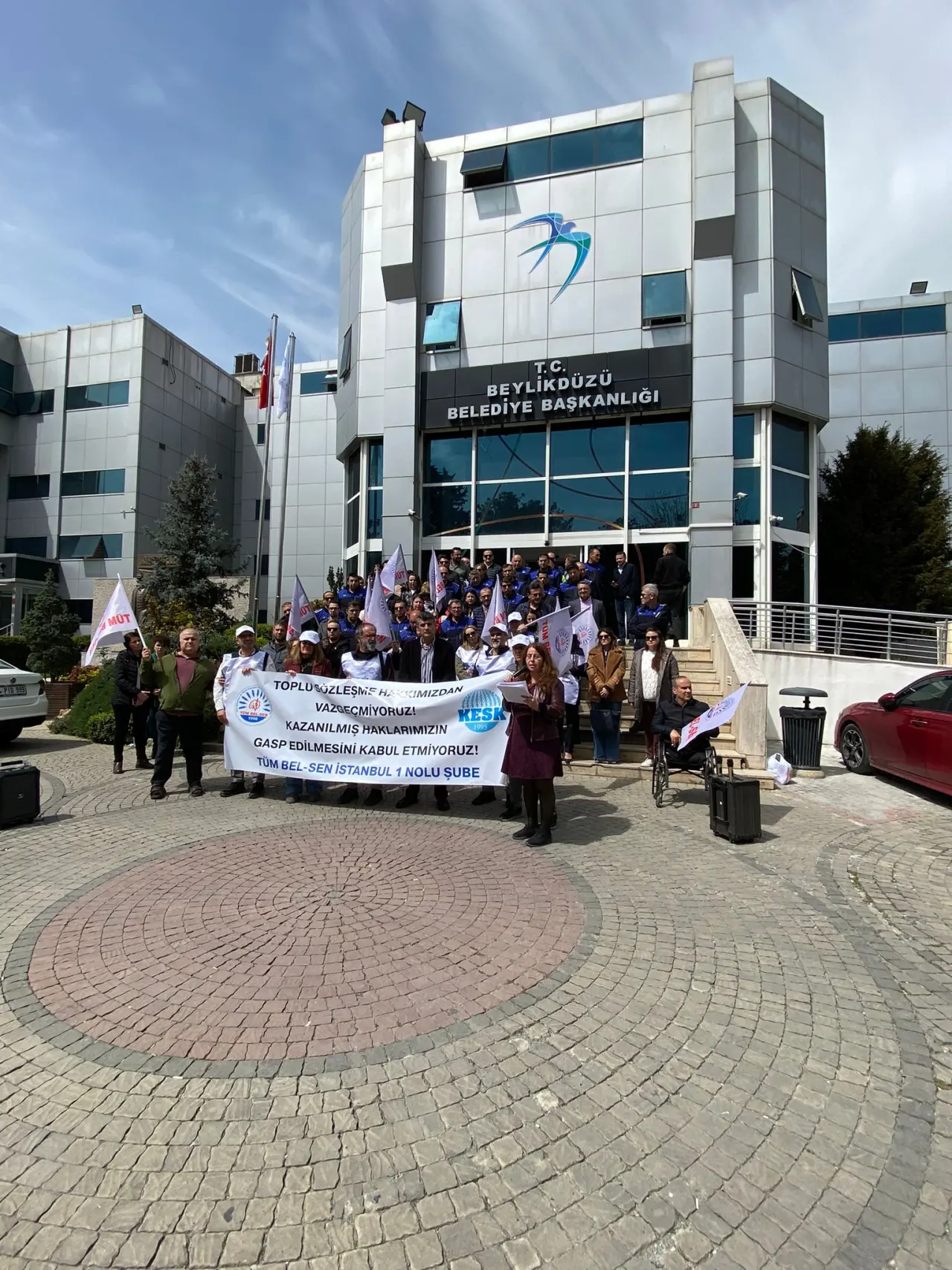 Beylikdüzü Belediyesi önünde bir araya gelen Tüm Bel-Sen İstanbul 1 No’lu Şube üyeleri, 2026-2027 toplu sözleşme görüşmelerinde yaşanan tıkanmayı protesto etti. Açıklamayı Şube Başkanı Meryem Göktepe yaparken, emekçiler basın açıklamasının ardından 10 dakika süreyle oturma eylemi gerçekleştirdi. Topluluk adına konuşan Meryem Göktepe, toplu sözleşme hakkının anayasa ve uluslararası sözleşmelerle güvence altına alındığını belirterek, “Toplu sözleşmeler; çalışma yaşamındaki sosyal, hukuksal, ekonomik ve demokratik haklarımızı korumak ve geliştirmek için yapılan uluslararası akitlerdir” dedi.