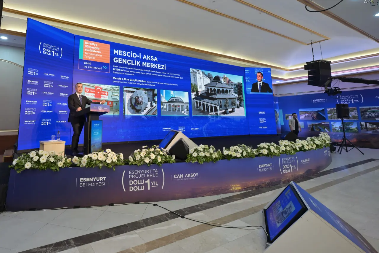 Esenyurt’a hizmet yolculuğunun birinci yılını doldurduklarını belirten Aksoy, “Yola çıkarken temel hedefimiz, ülkemizin en yoğun nüfusuna sahip ilçesi olan Esenyurt’u 21. yüzyıla yakışır bir şehre dönüştürmekti. Kronikleşmiş sorunları çözmek için bir an bile beklemeden çalışmaya başladık. Çalışmalarımızı üç ana kolda yürüttük: Yarım kalan projeleri tamamlamak, ilçemize değer katacak yeni projeleri hayata geçirmek ve Bakanlıklarımızla iş birliği. Bu kapsamda eğitimden sağlığa, sosyal destekten çevreye kadar her alanda hayata geçirdiği projelerle ilçede büyük bir dönüşüm süreci başlattık. Çünkü paylaşarak daha zengin olacağımızı düşünüyorum. Artık belediye başkanlarının kullandığı lüks yerler değil, halkın kullandığı alanlar açacağız. Belediye Nikah Sarayı'nda fotoğrafçı yüksek fiyatlarla çekim yapıyordu. Damatlara katkı olsun diye fotoğrafçıyı çıkardık. Artık herkes kendi fotoğrafçısıyla gelebiliyor. Demek ki rantçı değil halkçı kayyımım” dedi.