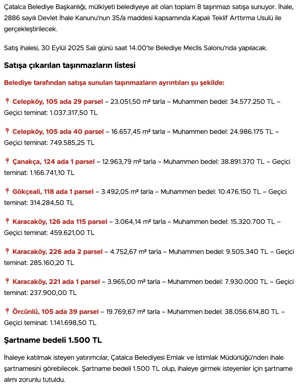 Milyonlarca liralık mal alım ihalelerini tek firma katılımıyla sözleşmeye dönüştüren CHP’li belediye yönetimi, Kamu İhale Kurumu’nun temel ilkelerinden biri olan “rekabetin sağlanması” ilkesini göz ardı etti. Bu durum, belediye kasasında ciddi bir kamu zararı oluştuğu iddialarını gündeme taşıdı. Cumhuriyet Halk Partili Belediye Başkanı Erhan Güzel yönetimindeki Çatalca Belediyesi, mali disiplini sağlamak amacıyla Çanakça, Celepköy, Gökçeali, Karacaköy ve Örcünlü başta olmak üzere birçok mahallede kamuya ait arsa ve tarlaları satışa çıkardı. Milyonlarca liralık satış gelirinin belediye kasasını rahatlatacağı beklentisi oluşurken, hizmet ve mal alım ihalelerinde rekabet sağlanmadan sözleşme imzalanması, belediyede ciddi bir mali açık olduğu iddialarını güçlendirdi.