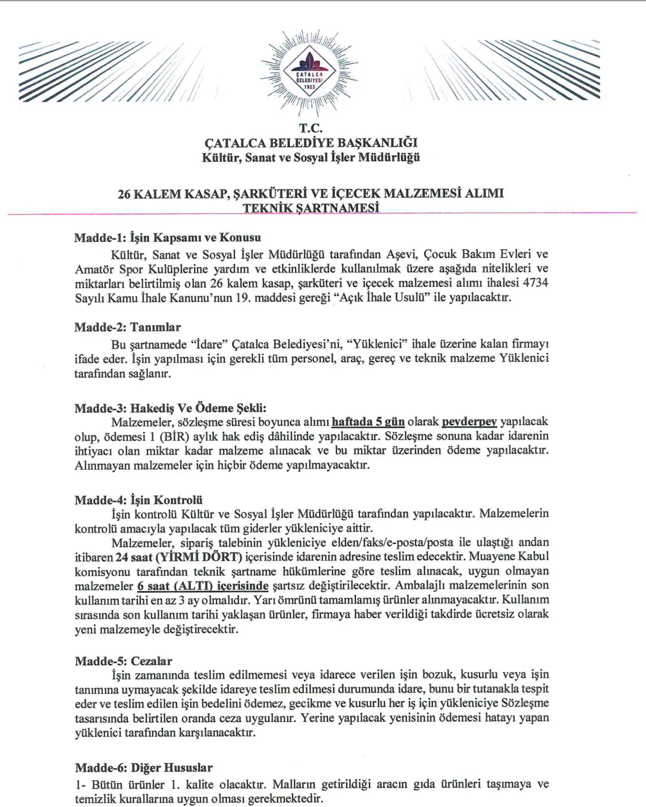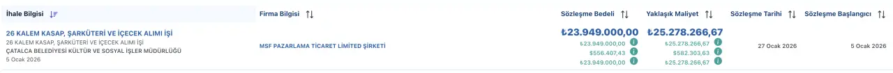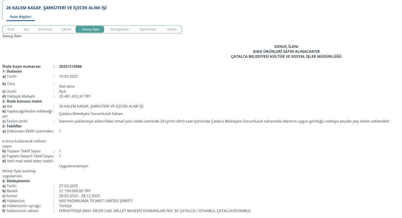 2026 yılı için yapılan gıda alım ihalesinde de benzer bir tablo ortaya çıktı. Çatalca Belediyesi, bu yıl da yine tek katılımcı olan aynı firmayla milyonlarca liralık mal alım sözleşmesi imzaladı. Teknik şartnamede aynı iş kalemlerinin farklı ağırlıklarla yer aldığı ihalenin bedeli 23 milyon 949 bin TL olarak açıklandı. İhalenin yüklenicisi MSF Pazarlama Ticaret Limited Şirketi olurken, geçen yıl olduğu gibi bu yıl da rekabet ortamının oluşmaması dikkat çekti. Aynı firmanın iki yıl üst üste milyonlarca liralık ihaleleri sorunsuz şekilde alması, Çatalca Belediyesi’nin kamu yararını gözetip gözetmediği sorusunu beraberinde getirdi. Yaşananların ilçenin siyasi gündeminde geniş yankı uyandırması bekleniyor.