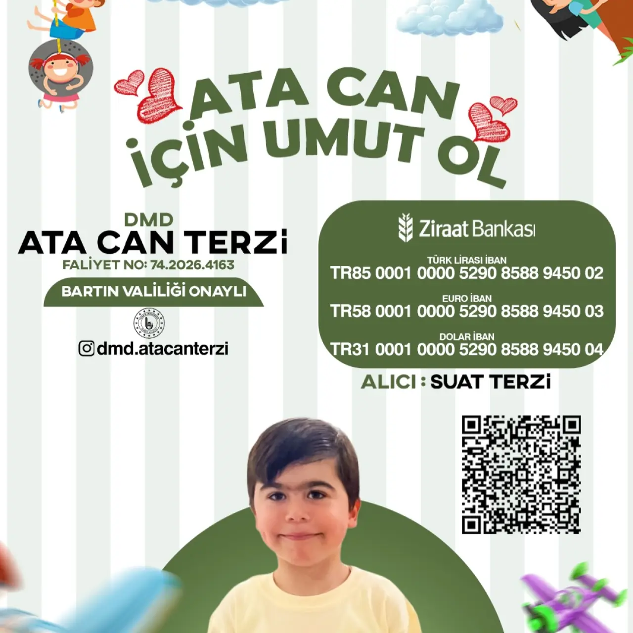 DMD kas hastalığıyla mücadele eden Ata Can Terzi iyileşmek ve sağlığına kavuşmak için sizlerin desteğini bekliyor. Anne Ebru Dadak Terzi ve baba İbrahim Terzi, hayırsever vatandaşlara seslendi. “Çocuğumuzun iyileşmesi için desteğinize ihtiyacımız var” dedi. Aile Ata Can Terzi'nin ağzından şu sözleri paylaştı; “Sadece Koşmak İstiyorum… Merhaba, ben Atacan. Henüz küçücüğüm ama omuzlarımda büyük bir yük var: DMD Kas Hastalığı. Arkadaşlarım parkta koşarken ben her geçen gün hareket yeteneğimi kaybediyorum. Ama yurt dışındaki gen tedavisi benim için bir mucize olabilir. Bu tedaviye ulaşmak için desteğine ihtiyacım var. Beni bu yolda yalnız bırakma, elimden tut…”