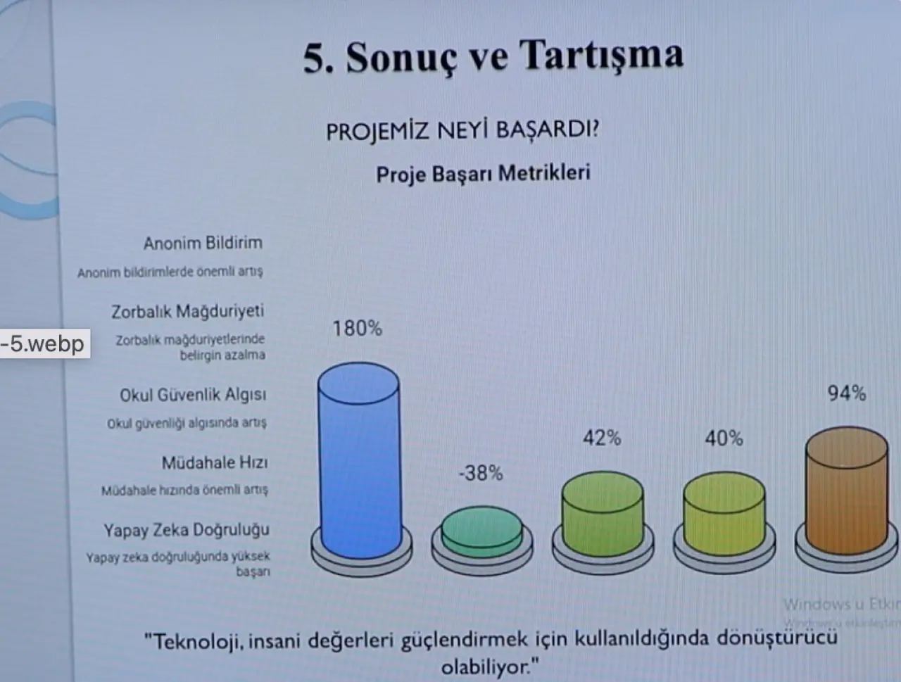 Hazırladıkları formlar aracılığıyla tüm sınıflardan gelen verileri yapay zeka ile analiz ettiklerini belirten Birinci, “Okuldaki tüm öğrencilere bu proje için hazırladığımız sorunları onlara sorduk ve yapay zeka ile analiz ettik. Kritik durumlar vardı, düşük riskler vardı, takip edilmesi gerekenler vardı. Biz bunu yapay zeka ile sınıflandırdık. Kritik durumlar anında rehberlik servisine iletilirken, oluşturulan dijital pano üzerinden de öğrenciler birbirlerine moral ve destek mesajları gönderdi. Bu siteyi kullanan öğrenciler sadece zorbalıklarını değil, desteklerini de paylaştılar. Desteklerini paylaşmalarından ziyade ‘Yanındayım, arkandayım, başarabilirsin’ gibi şeyler söylediler. Sonuç olarak biz ayda 5 adet bildirim alırken, 8 haftalık süreçte bu sayı 14’e çıktı. Susan değil konuşan, paylaşmayan değil, paylaşan öğrenciler hedefledik ve bu hedefleri de okul iklimine yerleştirmek istedik” ifadelerini kullandı.