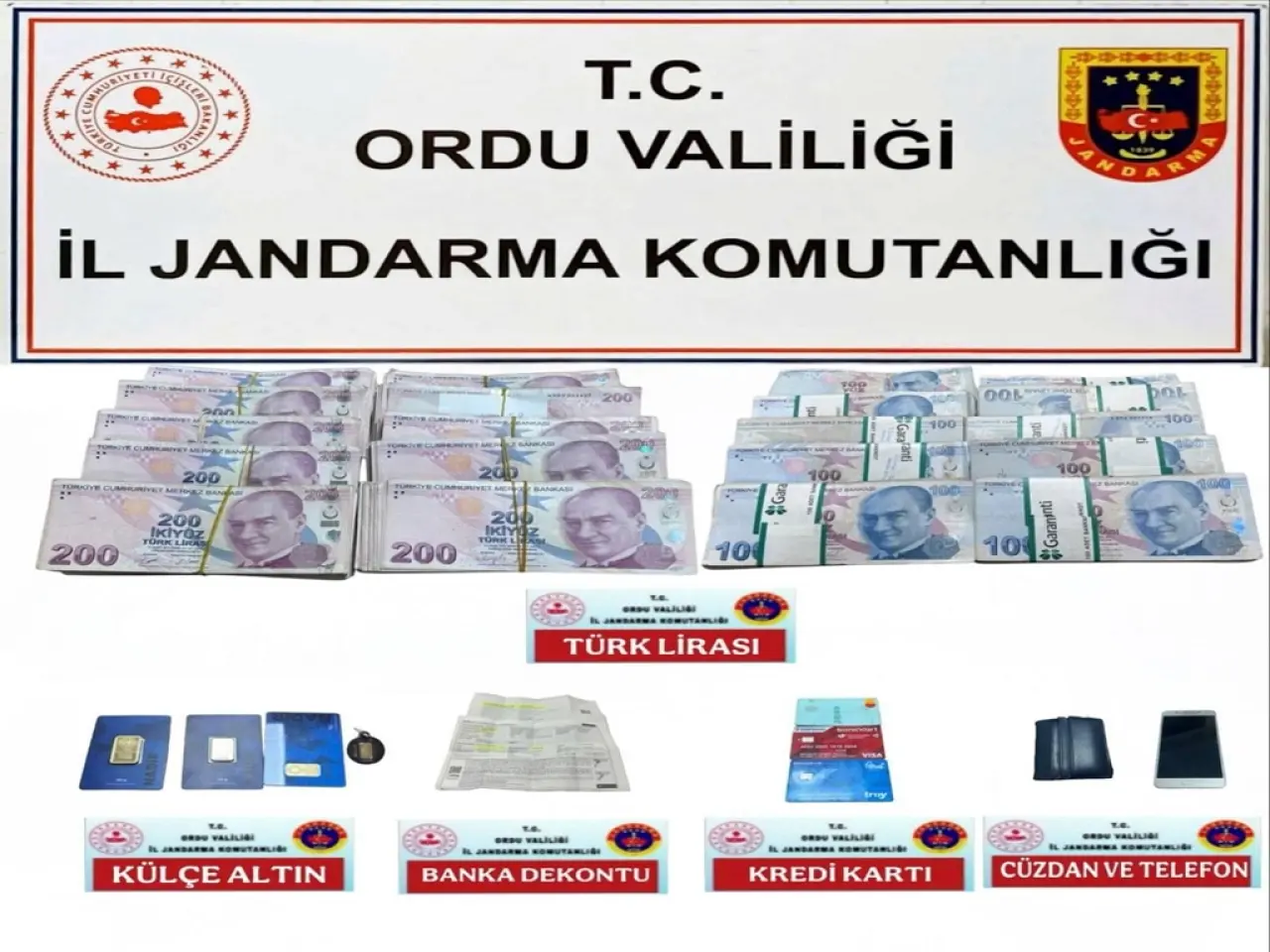 Altınordu ilçesi Kayabaşı Mahallesi’nde 26 Ocak’ta A.B.Ö’yü telefonla arayan kişi, kendilerini polis, jandarma ve savcı olarak tanıttı ve “Terör örgütü mensupları ile bağlantılarınız bulundu” diyerek ziynet eşyalarını aldı. 27 Ocak’ta da şüpheliler, Gölköy ilçesi Damarlı Mahallesi’ndeki O.Ç.’yi arayıp, aynı yöntemle dolandırdı. Yaklaşık 1 milyon TL’lik ziynet eşyalarını dolandırıcılara kaptıran mağdurların şikayeti üzerine İl Jandarma Komutanlığı ekipleri çalışma başlattı. Ekipler, şüphelilerin M.E.Ö. (20) ve B.K. (17) olduğunu tespit etti. Şüpheliler, Altınordu ilçesinde yakalanıp, gözaltına alındı. M.E.Ö. ve B.K.’nin üst aramasında, dolandırıcılık suçundan elde ettikleri 387 bin 70 lira, 36 gram külçe altın, 500 Özbekistan somu, suçta kullanılan cep telefonu ile 3 banka kartı ele geçirildi.